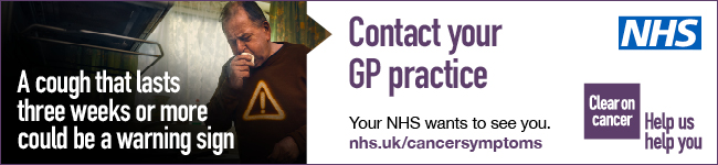 The aim of this campaign is to raise awareness of the key symptom of lung cancer – a cough that lasts for three weeks or more, and to encourage those who have this symptom to contact their GP practice. This resource can be downloaded and used in your e-mail signature to promote the campaign.