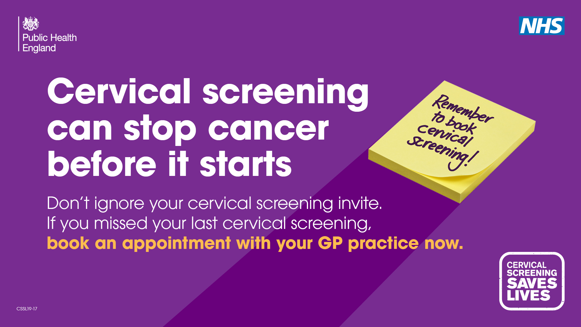 Cervical screening can stop cancer before it starts - post it note (pharmacy digital screen)