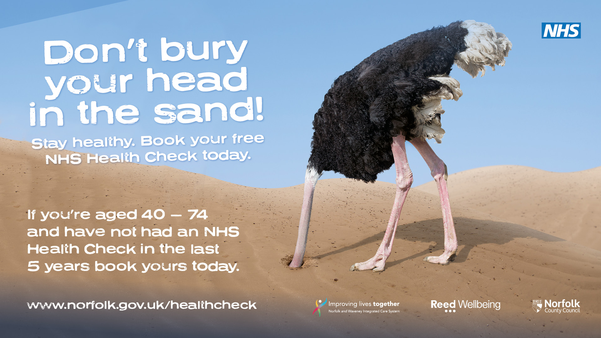 Don't bury your head in the sand! Stay healthy, book your free NHS Health Check today (digital screen)