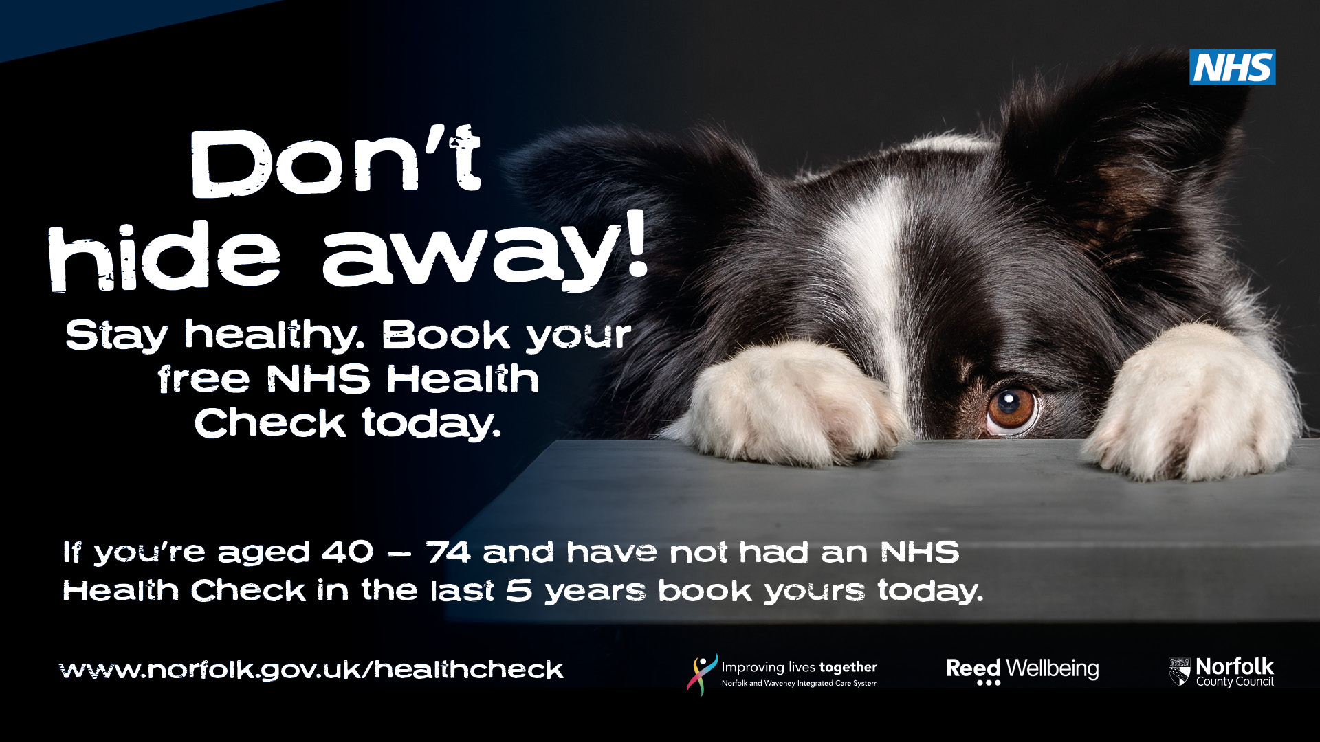 Don't hide away! Stay healthy, book your free NHS Health Check today - dog (digital screen)