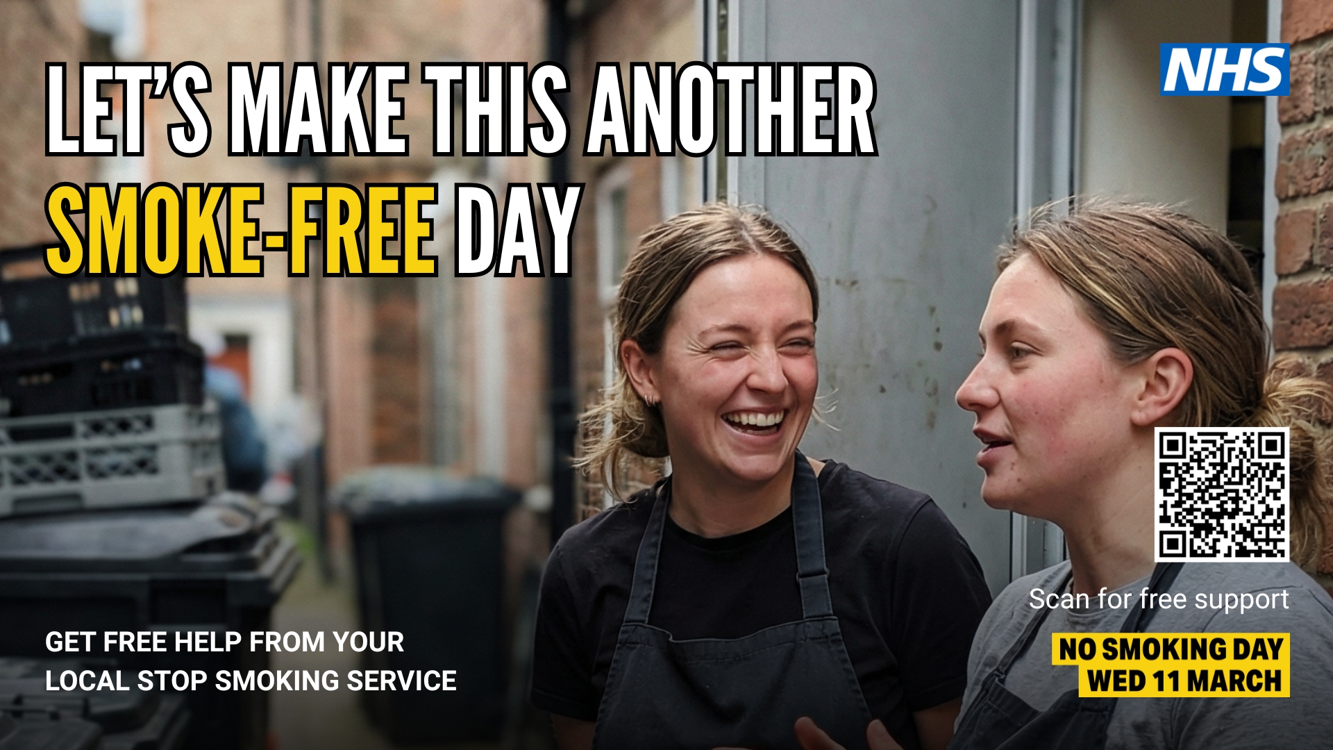 A digital screen for No Smoking Day (11 March 2026) using the tagline “A smoke-free life starts with a smoke-free day,” encouraging smokers to make NSD their first quit day. Get free help from your local stop smoking service.