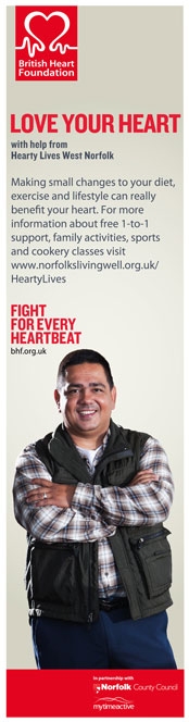 Email signature promoting the Hearty Lives West Norfolk programme - offering free one to one support, family activities, sports and cookery classes to help men improve their lifestyle.