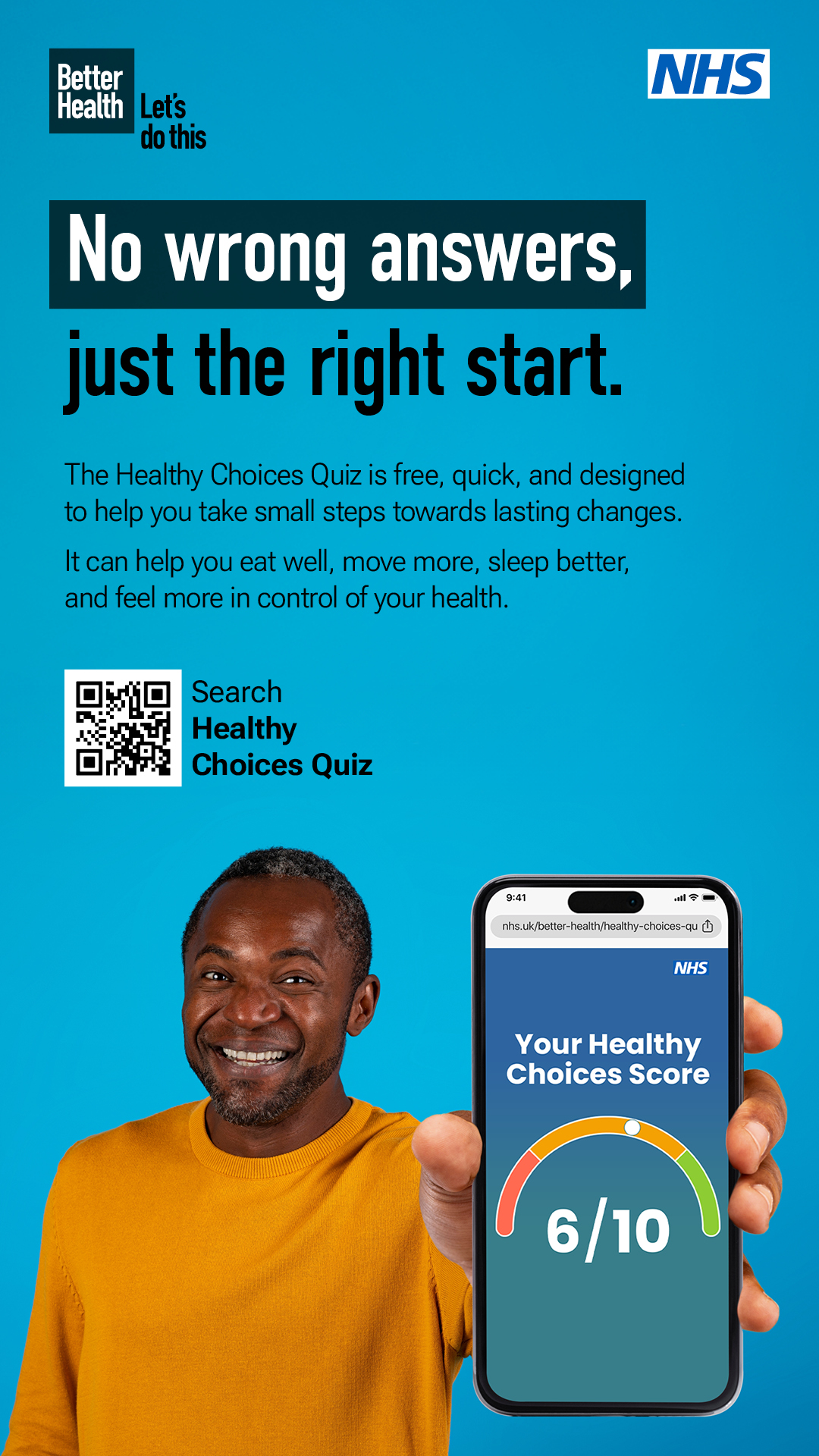 The Healthy Choices Quiz is free, quick, and designed to help you take small steps towards lasting changes. It can help you eat well, move more, sleep better, and feel more in control of your health.