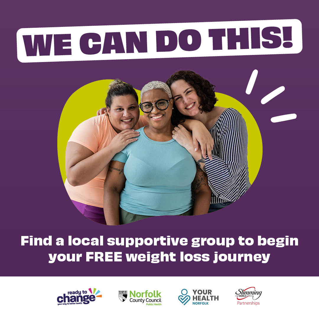 Find a local supportive group to begin your FREE weight loss journey. A new healthy weight campaign “We can do this!” encouraging adults in Norfolk to follow a healthier diet and find out how to achieve a healthy weight, has launched. As part of the support to help people eat more healthily and lose weight, Norfolk County Council’s commissioned partners Slimming World and Your Health Norfolk are offering free in-person group support sessions over 12 weeks to help you make gradual changes towards a healthy lifestyle.