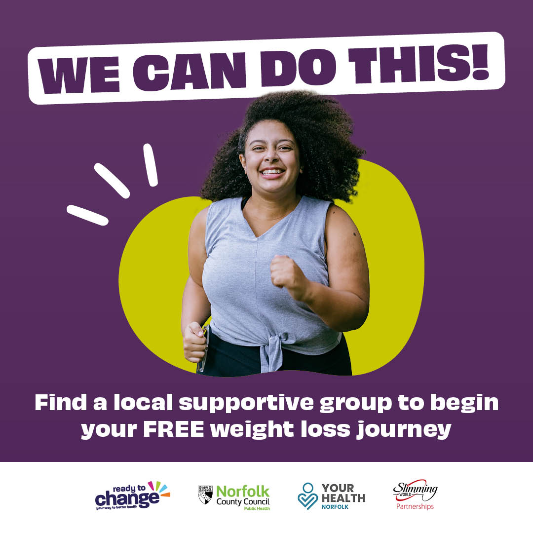 Find a local supportive group to begin your FREE weight loss journey. A new healthy weight campaign “We can do this!” encouraging adults in Norfolk to follow a healthier diet and find out how to achieve a healthy weight, has launched. As part of the support to help people eat more healthily and lose weight, Norfolk County Council’s commissioned partners Slimming World and Your Health Norfolk are offering free in-person group support sessions over 12 weeks to help you make gradual changes towards a healthy lifestyle.